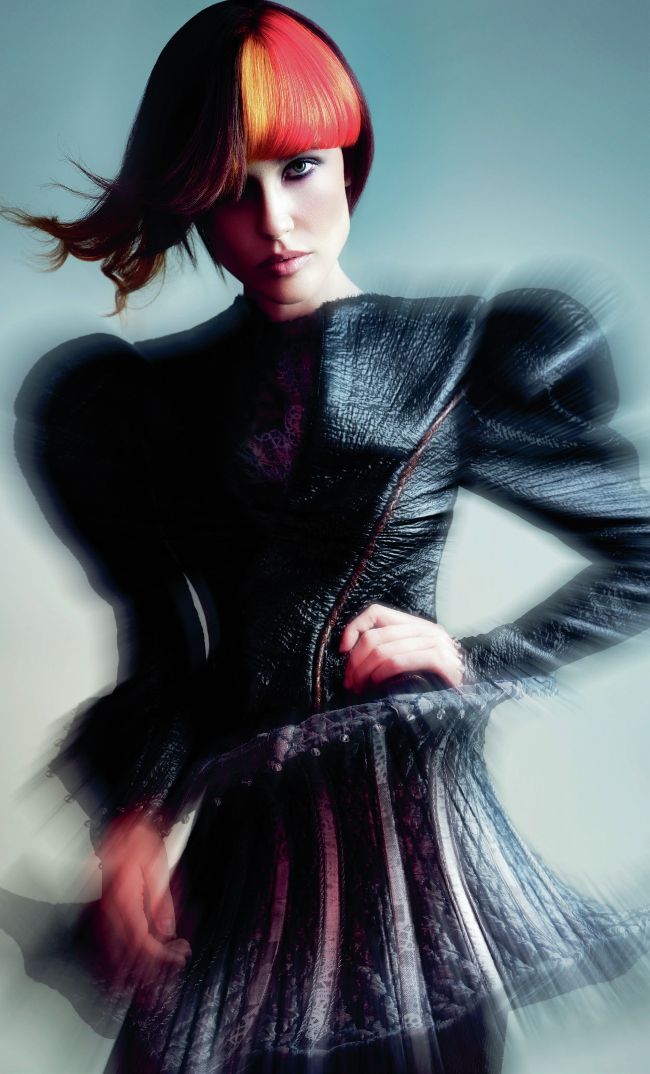 “Our collection is inspired by autumn/winter catwalk trends, fusing colour palettes and runway fashion silhouettes. Hard, forward-thinking styles, mixed with soft femininity and ballerina-esque vibes. Shapes and silhouettes from the runway inspired the way the team cut and coloured the looks for this shoot. The fabric, texture and tones have been used in the colouring techniques to give a couture feel to the collection. For the photography we wanted to emulate this fusion of soft and hard with distortion and abstraction creating a soft perimeter with hair clarity and strength within.”