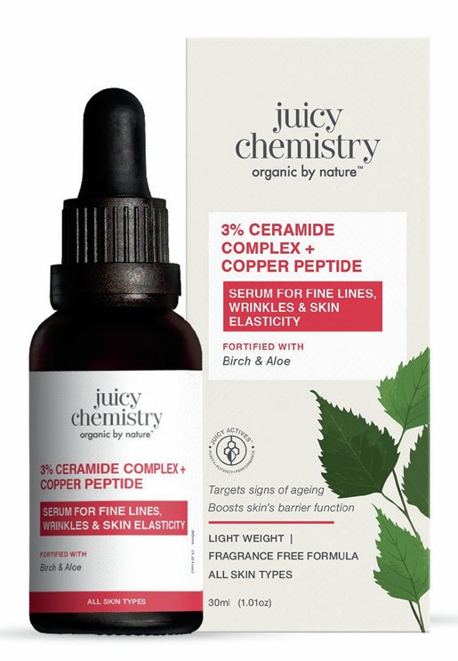 Juicy Chemistry has launched the 3% Ceramide Complex + Copper Peptide Serum to help strengthen and repair the skin barrier. The serum fights fine lines, wrinkles, and visible damage, leaving skin smoother, plumper, and visibly radiant. The formula has ceramides to restore lipids and retain moisture. It combines the same with copper tripeptide-1 to support collagen and elastin production. It also contains phytosphingosine to calm irritation and plant extracts of gotu kola and cucumber for hydration and antioxidant care. The lightweight serum suits all skin types and is free from alcohol, parabens, silicones, sulphates, artificial fragrances, PEGs and petrochemicals.