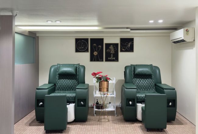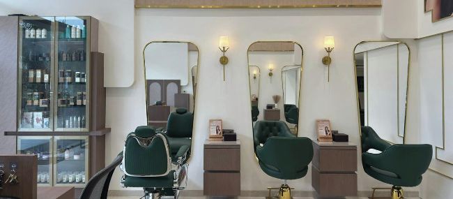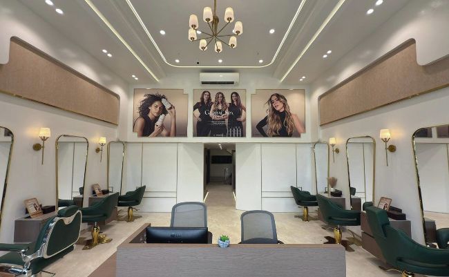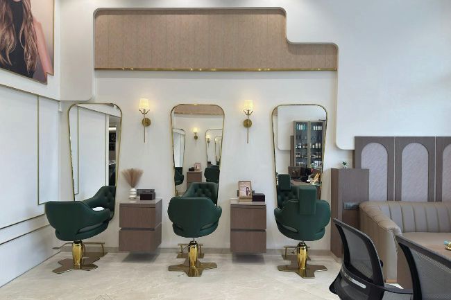 Customer comfort drove every decision. “We ensured no direct light hits the eyes; only warm, layered illumination,” says Karan. The pedicure zone has privacy curtains so women can feel relaxed. The chairs are relaxing but supportive, and the walkway to the shampoo area is clear, so clients don’t feel watched or crowded. “The idea was to create a premium yet calming environment that helps guests truly unwind.”